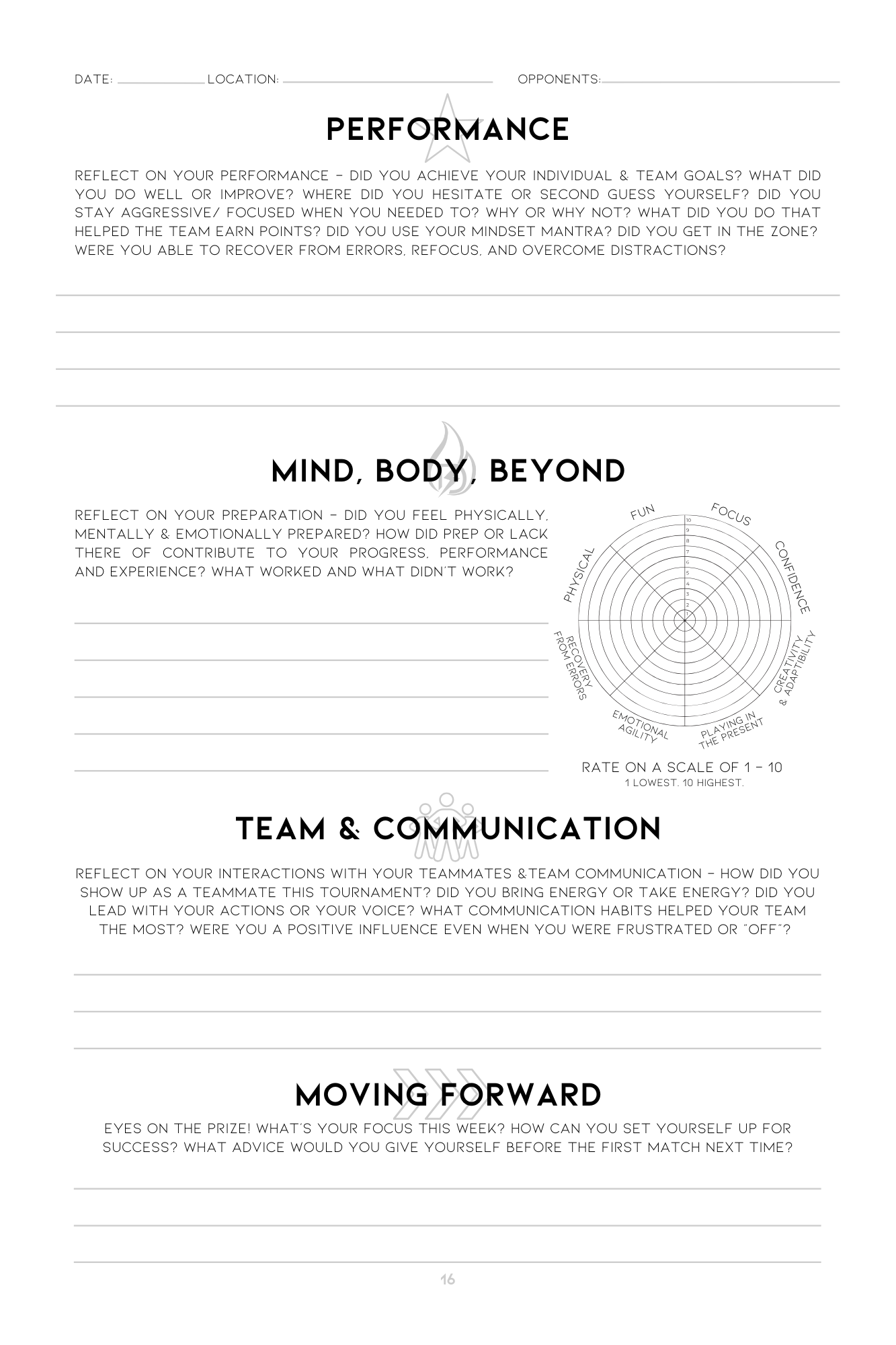 Mentally, physically, and emotionally prepare for competition with these pre & post-tournament worksheets.